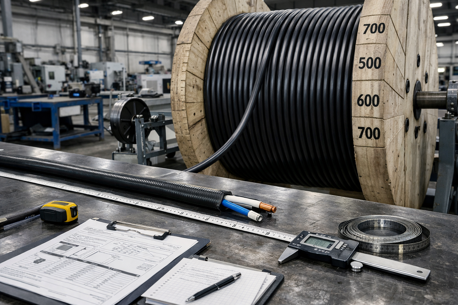 Технические условия обуславливают обязательные размеры строительного кабеля на отрезке, он обязан быть нумерованным. Исходя из конструкции, а так же допустимого напряжения, обыкновенная длина строительных кабелей достигает от двухсот метров до 450 метров. Маломерные отрезки могут быть пятидесяти и ста метровые. Существуют стандартизированные отрезки и длина для силовых строительных кабелей, которые зависят от строения кабеля и напряжения тока, проходящего по нему.
